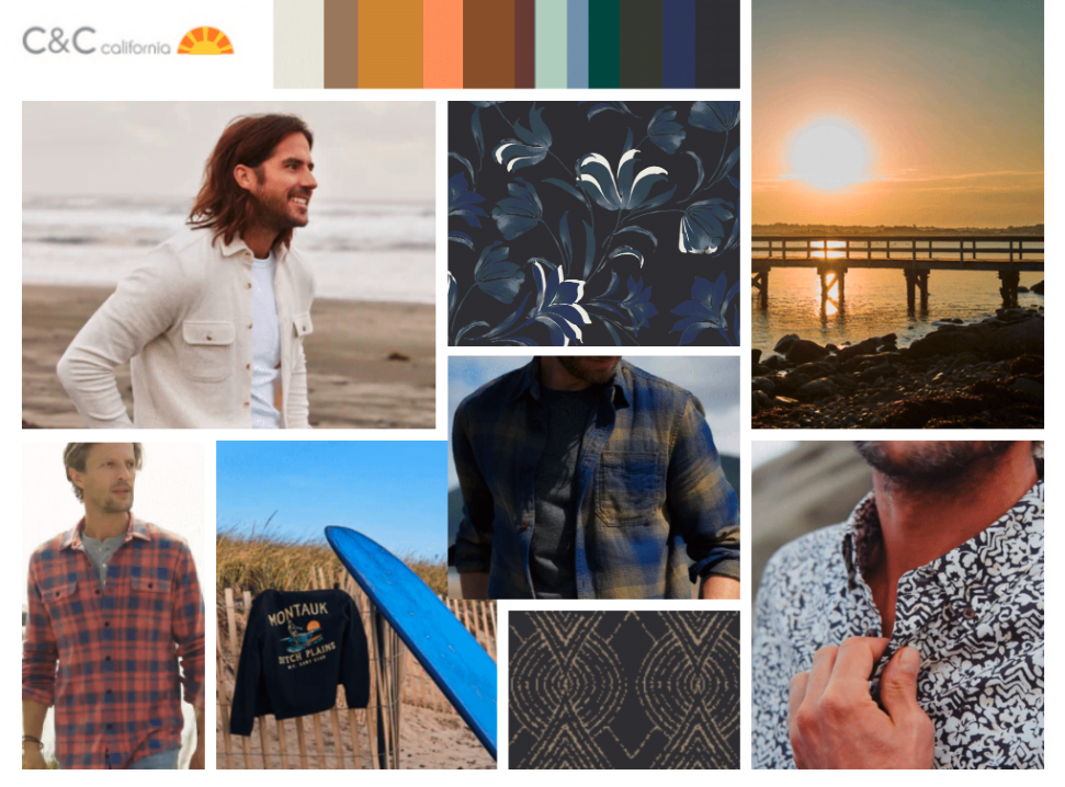 This brand identity establishes a sophisticated coastal rustic aesthetic, blending the relaxed nature of the California lifestyle with rugged, comfortable apparel. The color palette combines warm sunset tones (sandy beige, burnt orange) with deep ocean shades (navy, forest green) to evoke a sense of natural authenticity and versatility. Key imagery, featuring layered plaid shirts, refined prints, and beach settings, positions C&C California as a premium casualwear brand for the customer who values comfort, quality, and an effortless connection to the outdoors.